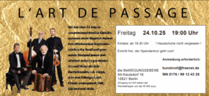Freitag 24.10.25 Einlass: ab 18:30 Uhr Eintritt frei, der Spendenhut geht rum! ! Hausschuhe nicht vergessen ! Die seit über 35 Jahren zusammenspielenden Künstler spannen einen Bogen zwischen den altbekannten Repertoirestücken der Band und ganz neuen Kompositionen und mischen dabei in gewohnter Art und Weise die Stile durcheinander, z.B. Tango, Jazz und Milonga, Latin, Classic-recomposed, Folk, Minimal und mehr. Anmeldung erforderlich: kunstvoll@freenet.de WA 0176 / 99 12 43 20 19:00 Uhr